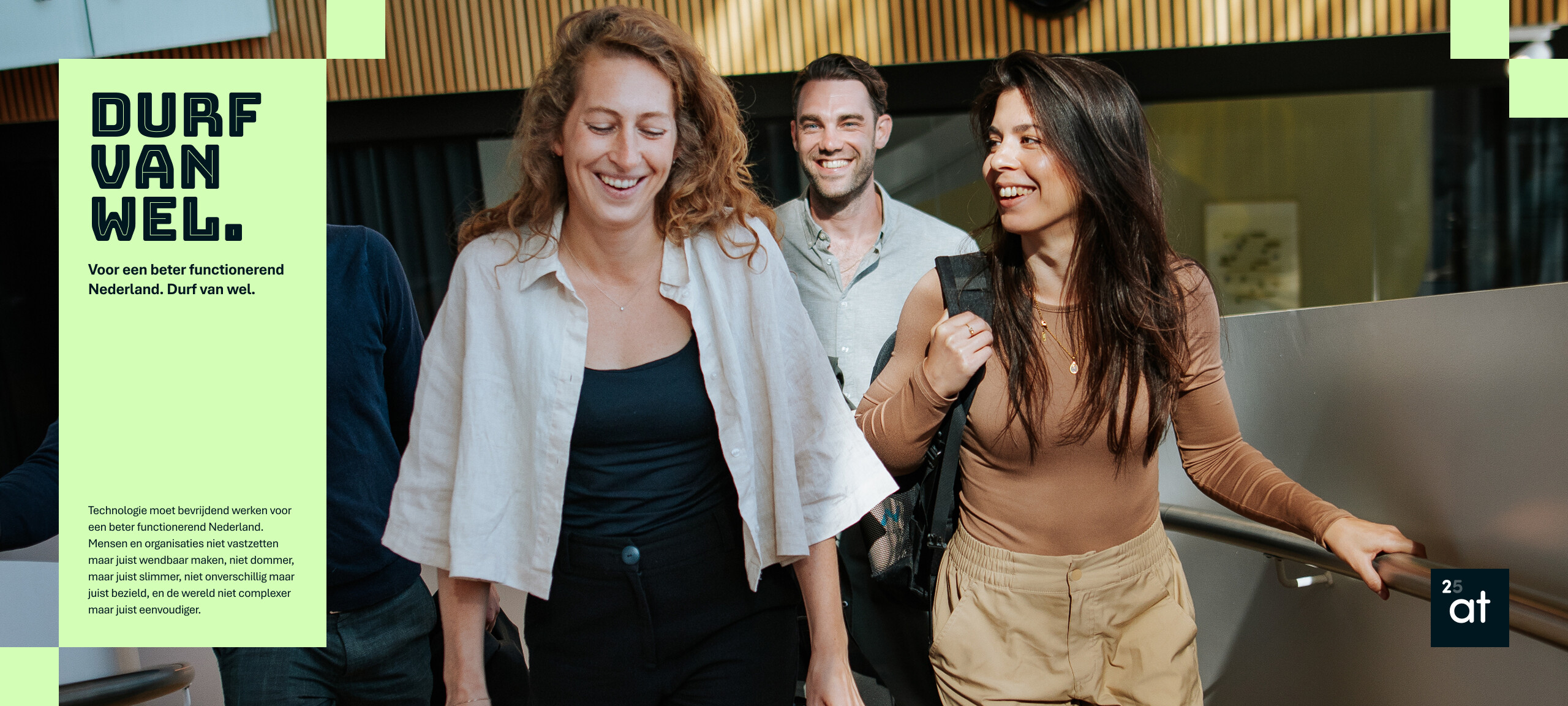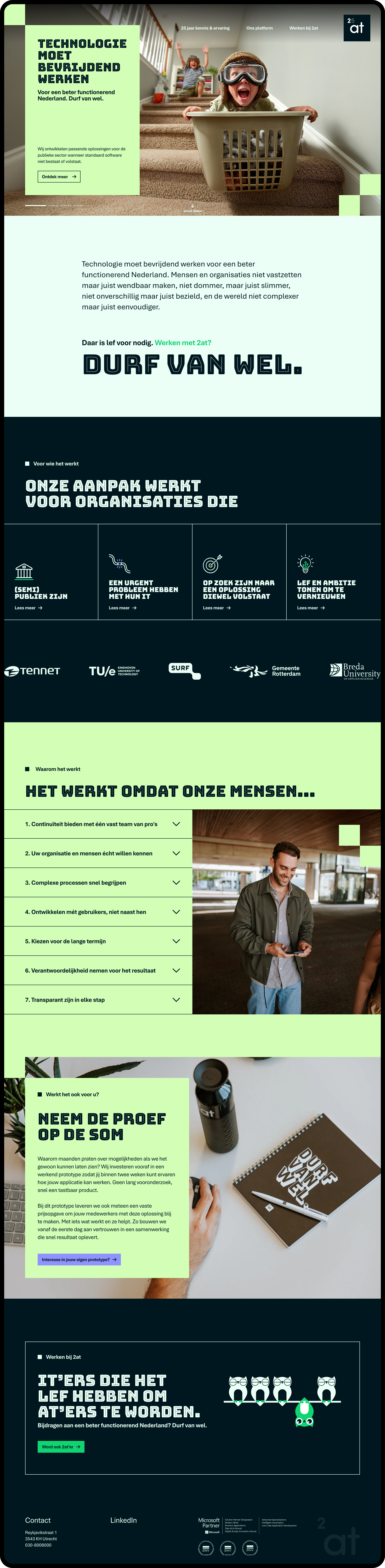 De vernieuwde site geeft het bestaande karakter van 2at een scherpere stem op twee doelgroepen tegelijk. Voor potentiële klanten in de publieke sector is het verhaal nu concreter: dit is wie we zijn, dit is hoe we denken, en dit is waarom dat voor jou het verschil maakt. Voor kandidaten biedt de site een eerlijk en herkenbaar beeld van hoe het is om bij 2at te werken. Dat gevoel van vrijheid, vertrouwen, bijdragen aan iets met maatschappelijke impact was er altijd al. De vernieuwde site zorgt ervoor dat het zichtbaar is vóórdat iemand de deur binnenstapt.